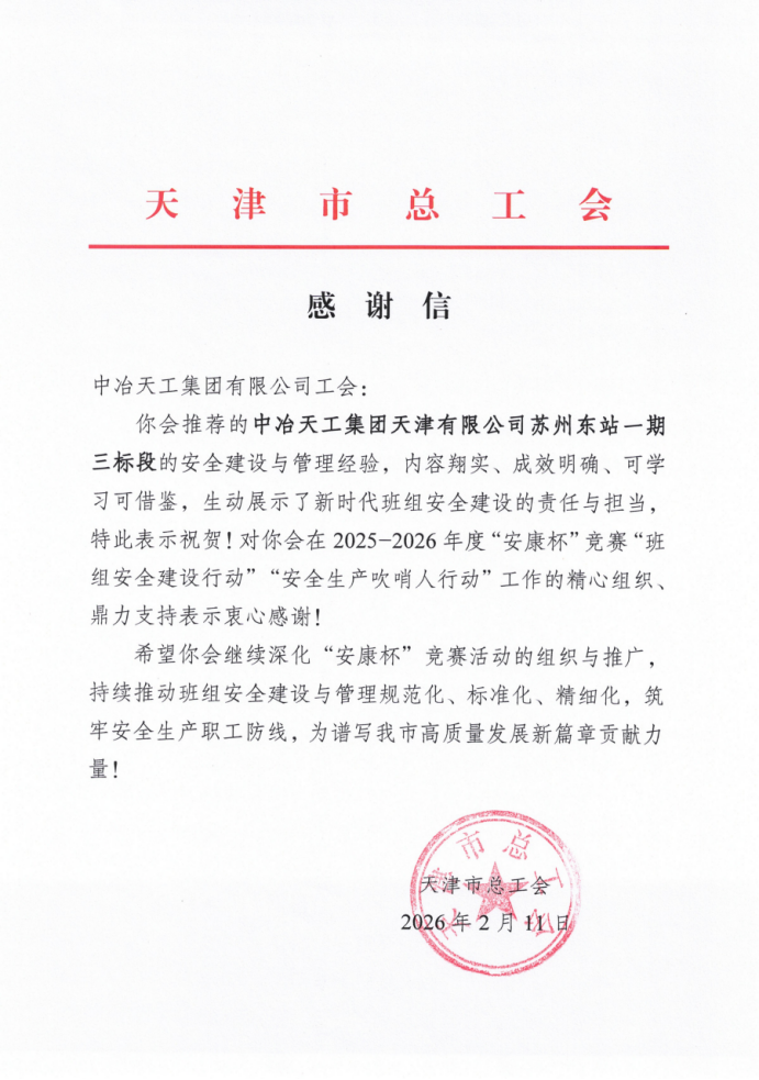近日,公司收到天津市總工會發來的感謝信,信中對公司推薦的蘇州東站一期三標段的安全建設與管理經驗表示肯定,指出該項目案例內容翔實、成效明確、可學習可借鑒,生動展示了新時代班組安全建設的責任與擔當。同時,信中還對公司在2025—2026年度“安康杯”競賽“班組安全建設行動”“安全生產吹哨人行動”工作的精心組織、鼎力支持表示感謝。
